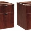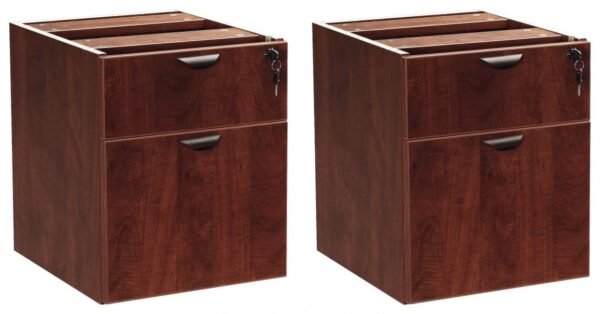The set of 2 drawer hanging pedestals should be installed into Commerce Laminate series desks by Boss Office Products. Each pedestal has one box drawer, one file drawer and they can be installed to hang from underneath the desktop. This item locks, comes with a key and it’s available in different finishes, Mahogany shown.
