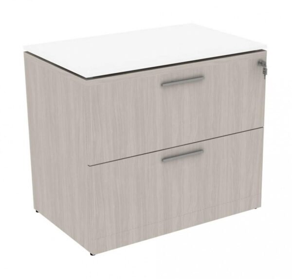 The small lateral file cabinet has contemporary aluminum pulls and a floated glass top. It’s made from a high quality laminate and you can choose from different finish options, Blanc De Gris shown. Quality backed by a limited lifetime warranty.
