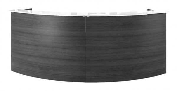 The modern reception desk for two is constructed from a low-glare, premium grade laminate that looks and feels like real wood. The model in the picture has a Grigio finish with a glass transaction counter and you can choose from different sets of drawers. You can also choose from various finish options and it is backed by a limited lifetime warranty.