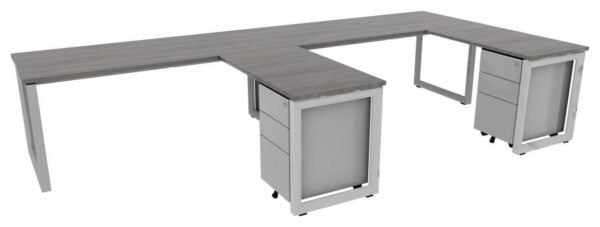 The office desk for two is available in different sizes, finishes, and you can choose from multiple sets of drawers. It has metal loop-legs and a high quality laminate top that’s scratch resistant and easy to clean. As pictured, it’s shown in a Grigio finish and it has a reversible design that allows you to install the returns on either side. Quality backed by a limited lifetime warranty.
