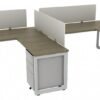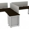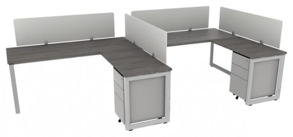 The 2 person l shaped desk is part of the Veloce series by Corp Design. You can order it in different sizes and finishes with your choice of drawers for storage. As pictured, it’s shown in a Grigio finish with four acrylic divider panels and two 3-drawer mobile pedestals. Quality guaranteed by a limited lifetime warranty.
