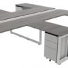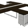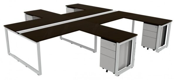 The 4 person workstation desk has stylish metal legs and a high quality laminate top with a built-in aluminum access door for cable management. It’s available in different sizes, finishes, and you can choose from multiple sets of drawers. As pictured, it’s shown in an Espresso finish and optional power is available and can be purchased separately. Quality backed by a limited lifetime warranty.