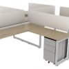 The 4 person desk pod has a scratch resistant laminate top with a built-in aluminum access door for cable management and acrylic divider panels. It’s available in different sizes, finishes, and you can choose from multiple sets of drawers. It’s shown in a Grigio finish and optional power is available and can be purchased separately. Quality backed by a limited lifetime warranty.