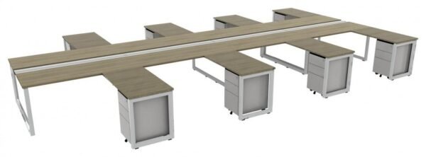 The multi person workstation desk has metal legs and a thermally-fused laminate top with PVC edge banding and an aluminum access door for easy cable management. It’s available in different sizes, finishes, and you can choose from multiple sets of drawers. It’s shown in a Noce finish and optional power is available and can be purchased separately. Quality backed by a limited lifetime warranty.