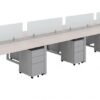 The 8 person workstation desk can be ordered in different sizes, finishes and you can choose from multiple sets of drawers. As pictured, it’s shown in a Noce finish with eight mobile sets of drawers for storage. Quality guaranteed by a limited lifetime warranty.