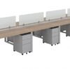The 8 person office desk can be ordered in different sizes and finishes, with your choice of drawers for storage. Each station features a shared privacy panel and an aluminum access door with integrated wire management. You can also select a color for the frame, and optional power is available and can be purchased separately. Quality backed by a limited lifetime warranty.