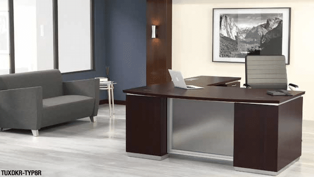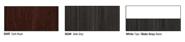 Tuxedo. Contract-grade laminates are accented with Silver reveal and base trim, aluminum finish drawer pulls and frosted glass/aluminum frame modesty panels and hutch doors. Silver-finish dual-electric, dual-USB power unit is standard in all bridges, returns and table tops to instantly power office technology. Full depth pedestals and full-height modesty panels are standard.Pedestals include single-key, side locking. Modular table components create 48” round, 48” square and expandable rectangular conference tables. Tables feature standard dual-electric, dual-USB power unit with 3-way wire management in all table bases.