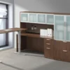 This L-shaped height-adjustable computer desk is designed to maintain its sleek appearance for years, even with continuous daily use. It includes a locking pedestal drawer unit, lateral file drawers, and two overhead hutches with frosted glass doors. Available in a variety of finish options, the desk is constructed from industrial-grade, scratch-resistant laminate and is supported by a 5-year manufacturer’s warranty.