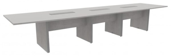 The laminate conference table has aluminum accented panel bases and built-in grommets with soft-touch aluminum covers. It’s available in different sizes with your choice of finish, Blanc De Gris shown. Quality guaranteed by a limited lifetime warranty.