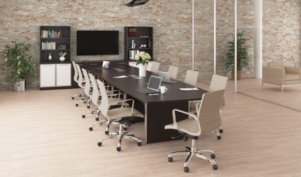 The high-end conference table is constructed with a scratch resistant laminate and it has pre-installed grommets where power modules can be easily installed. The model in the picture has an Espresso finish with a wire management base that allows you to organize cables below the surface through the middle of each panel. You can order it in different sizes, finishes and it’s backed by a limited lifetime warranty..