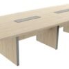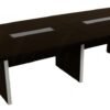 The conference room table is available in different sizes and you can choose form several vibrant finish options, Espresso shown. It has aluminum accented panel bases and built-in grommets where power modules can be installed. Quality backed by a limited lifetime warranty.