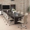 The boat shape conference table features top quality laminate construction with 3mm PVC soft edges, pre-installed grommets and a wire management base that allows you to organize cables below the surface through the middle of each panel. The model in the picture has an Espresso finish and it comes with height adjustable chairs that are upholstered in Tan leather. It is available in several different sizes, finishes and it’s backed by a limited lifetime warranty.