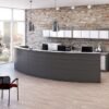 The curved reception desk features top quality laminate construction that is designed for full time use in an office environment. The model in the picture has a Grigio finish with three sets of drawers and a glass transaction counter. It’s available in different sizes and finishes with your choice of drawers for the desk. You can also add credenza storage and a wall mounted hutch for maximum storage. Quality backed by a limited lifetime warranty.