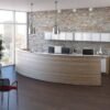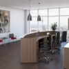 The curved reception desk is made from a high quality laminate that looks and feels like real wood. The model in the picture has a Noce finish with three sets of drawers and a glass transaction counter. It’s available in different sizes, finishes and you can choose from multiple sets of drawers for the desk. You can also add credenza storage and a wall mounted hutch for maximum storage. Quality backed by a limited lifetime warranty.