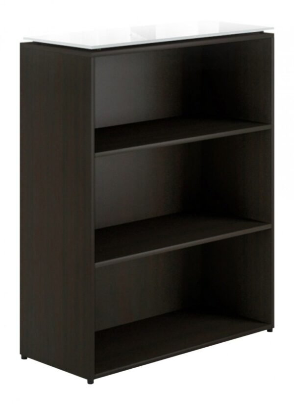 The small bookcase is made with a commercial grade laminate that’s completely solid and it’s available in different sizes with your choice of finish. The model in the picture has an Espresso finish with height adjustable shelves and a white floated glass top. Quality guaranteed by a limited lifetime warranty.