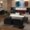 The executive desk is available in different sizes with your choice of Glass or Laminate hutch doors, Glass shown. You can choose a top finish, base finish, and custom upholstery is available for the tackboard. You have your pick of leather club chairs and there are multiple sets of drawers available for the credenza. Quality backed by a limited lifetime warranty.