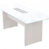 The small conference room table is available in different sizes, finishes, and optional power modules are available and can be purchased separately. Shown in a Miele finish, it has a laminate base with aluminum accented edges and a frosted white glass top, paired with a soft-touch aluminum grommet cover. It has adjustable leveling glides for added stability and it’s guaranteed by a limited lifetime warranty.