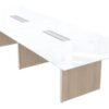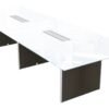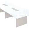 The large conference table has a frosted white glass top, complimented by an aluminum-accented laminate base that’s available in different finishes, Blanc De Gris shown. It comes equipped with adjustable leveling glides for enhanced stability and pre-installed grommets for easy cable management. Optional power modules are available and can be purchased separately. Quality guaranteed by a limited lifetime warranty.
