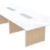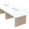 The rectangle conference table is available in different sizes with your choice of finish for the base, Miele shown. It comes with a frosted glass top in white, complemented by a durable laminate base with sleek aluminum-accented edges. The table includes built-in grommets for cable management, and optional power modules are available for purchase separately. Quality guaranteed by a limited lifetime warranty.