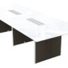The boardroom conference table features an aluminum-accented laminate base and a frosted glass top that comes standard in white. The top has built-in grommets, and optional power modules are available and can be purchased separately. It’s available in different sizes and you can choose from multiple finishes, Blanc De Gris shown. Quality backed by a limited lifetime warranty.