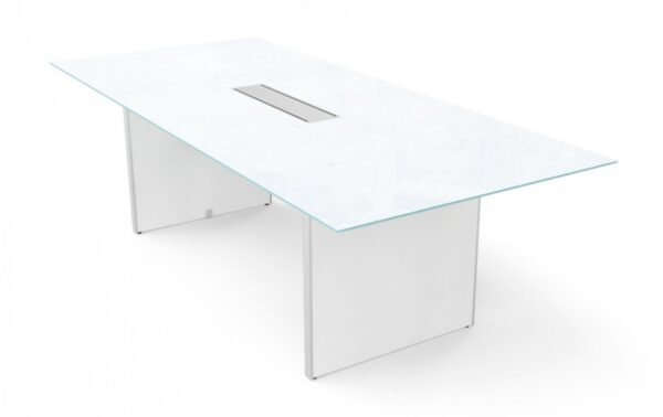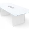 The modern conference table is constructed from top-quality materials, including a frosted glass top that’s paired with an aluminum-accented laminate base. The glass top comes standard in white, and you can choose from multiple finishes for the base, Blanco shown. It has adjustable leveling glides and a built-in grommet for cable management. Quality backed by a limited lifetime warranty.