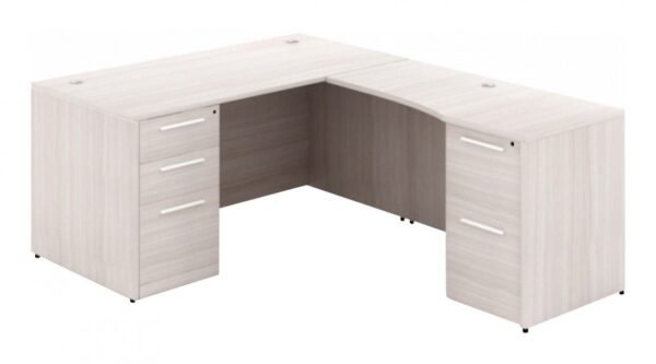 The Corp Design Potenza series L shaped desk is constructed with a high-density thermofused laminate shell that is extremely durable and scratch resistant. This laminate material is built to withstand the most demanding of office work for many years. To prove this, all Corp Design desks are backed by a ten year warranty. That means that the Corp Design desk is going to have many years of dedicated service. This L shaped computer desk is a great addition to an office. It provides a solid workstation; the L shaped office desk allows for multiple projects to be separated on each tabletop. This multitasking friendly office furniture provides great organization within a functional L shaped computer desk. An L shaped office desk is one of the most popular office furniture designs on the market today. The Corp Design Potenza series L shaped desk is a fantastic example of this. L shaped computer desks are highly desirable and for that reason they have many options to choose from.  There are many for design considerations. No matter which design aesthetic an office is, Corp Design has a finish to fit smoothly in the space. The Potenza finishes are a collection that has at least one that will be the perfect fit a style. The finishes are Blanc De Gris, Espresso, Grigio, Miele and Noce. With Corp Design, their L shaped computer desks are made in the USA. That means that purchasing one of their desks supports an American company with American workers. In these times of international shipping, sometimes it’s a nice bonus to know that a purchase supports a neighbor. This is true even with the purchase of an L shaped office desk. For some people this is an important factor in purchasing office furniture. The L shaped computer desk fits well in most offices because of its shape. The L shaped desk has a return that can be set on either the left or right of the main desk. Not only that, but the L shaped computer desk can be set up in multiple places within an office. Whether it’s in a corner, against a wall or in the center of the room, there is a great fit to be made. The L shaped office desk a great choice when it’s time for new office furniture.