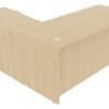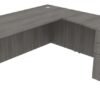 The large l shaped desk is made from commercial grade laminate, and you can order it with a return on either side, Right shown. As pictured, it features a Grigio finish, built-in grommets, and adjustable leveling glides for increased stability. It is available in different sizes and finishes, with customizable drawer options for storage. Quality backed by a limited lifetime warranty.
