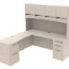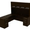The l shaped executive desk features premium grade laminate construction and can be ordered with the return on either side, Left shown. It comes with pre-installed grommets, adjustable leveling glides, and a hutch with glass doors and a floating glass top. It’s available in different sizes, finishes, and you can choose from multiple sets of drawers. Quality guaranteed by a limited lifetime warranty.