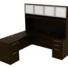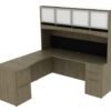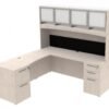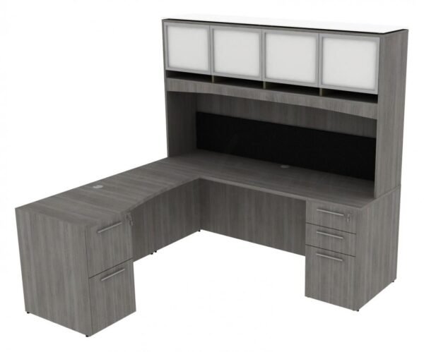The l-shaped desk is made from industrial grade laminate and can be ordered with the return on either side, Left shown. It includes integrated grommets, adjustable leveling glides, and a hutch with frosted glass doors and a floating glass top. Available in various sizes and finishes with your choice of upholstery for the tackboard, it offers multiple drawer configurations and is backed by a limited lifetime warranty.