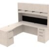 The l shaped computer desk features top quality laminate construction and can be ordered with the return on either side, Left shown. It comes with built-in grommets and a hutch with glass doors and a floating glass top. Available in various sizes and finishes, with your choice of upholstery for the tackboard, it also offers multiple drawer configurations and is guaranteed by a limited lifetime warranty.
