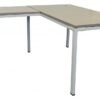 The l computer desk can be custom ordered in different sizes, finishes and you can choose from multiple sets of drawers. It has steel legs with adjustable foot glides and a scratch resistant laminate top that is designed for full time use in an office environment. It’s shown in a Driftwood finish and it has built-in grommets for cable management.