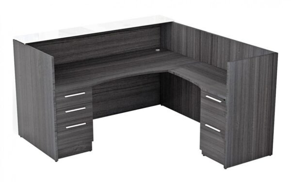 The office reception desk is constructed from a thermally fused laminate and you can order it with a left or right-side return when facing the desk. It’s available in different finishes and you can choose a Laminate or Glass transaction top. The model in the picture has an Grigio finish with 2 sets of drawers and a Glass top, Right return shown. Quality backed by a limited lifetime warranty.
