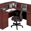 The L-shaped reception desk is available in various sizes and can be ordered in either rectangular or L-shaped configurations. You can select from multiple finish options to suit your space. The model shown features a Mahogany finish with two locking drawer units, displayed here in the L-shaped configuration. Multiple drawer configurations are available for ample storage, and the desk is backed by a 5-year manufacturer’s warranty for quality assurance.