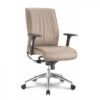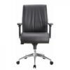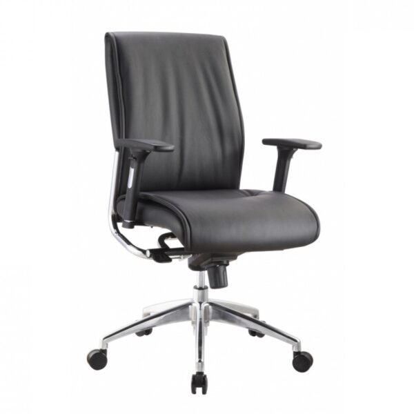 The mid-back office chair has leather upholstery with a chrome steel frame and a reinforced polished cast aluminum base. It is height adjustable with tilt lock, tension control and has adjustable arms that can rotate from side to side and can move forward, backward, up and down. It can support up to 300 lbs. and is available in different colors.