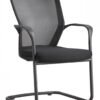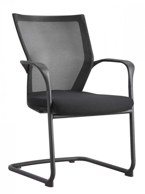 The guest chair by Corp design has a black fabric seat with a flexible mesh back and a powder coated steel base with molded nylon arms. It has a maximum weight capacity of 250 lbs. and comes with a limited lifetime warranty.