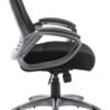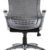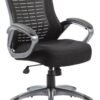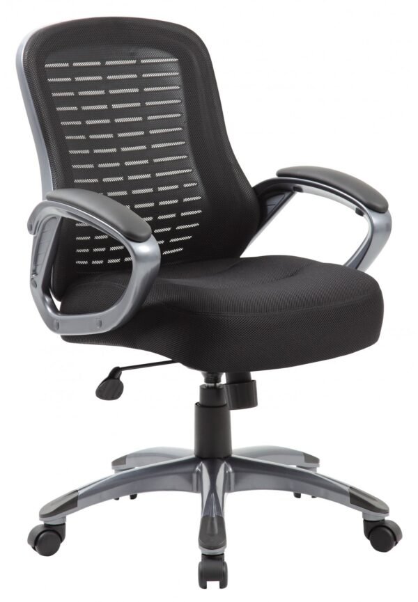 The high back office chair is height adjustable with a spring tilt mechanism, upright position tilt-lock and a tilt-tension adjustment. It has a 4″ molded foam cushion with fabric upholstery, fixed loop arms with padded armrests and a ribbed mesh back that is curved for optimal lumbar support. The base has a gun metal finish and it can support up to 275 lbs.