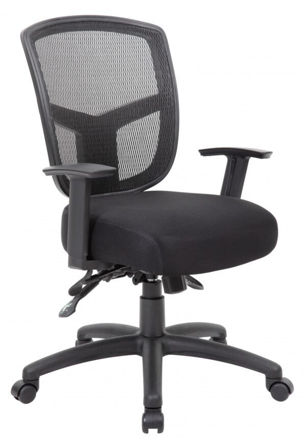 The mesh office chair has a multi-function control mechanism that allows the seat and back to be independently adjusted and locked in any position within the tilt range. It has a 4″ thick contoured foam seat cushion with black fabric upholstery and a breathable mesh back. It’s height adjustable with adjustable arms and it has a weight capacity of 275 lbs.