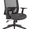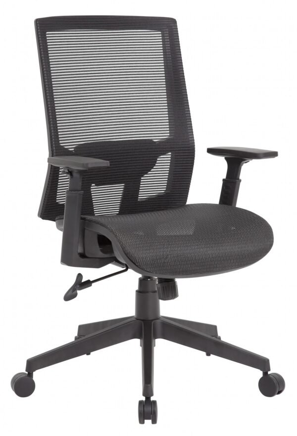 The full mesh office chair is height adjustable with a synchro-tilt mechanism that adjusts the seat and back angle at a 2:1 ratio and it has built in lumbar support. The all Black chair has a mesh seat and back with adjustable arms and a nylon base with dual-wheel casters. It has a maximum weight capacity of 275 lbs.