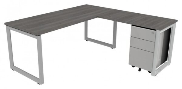 The l shaped desk by Corp Design is available in different sizes, finishes, and you can choose from multiple sets of drawers. It has metal loop-legs and a thermally-fused laminate top that has a rich wood look and feel. As pictured, it’s shown in a Grigio finish with one mobile 3-drawer pedestal and it’s backed by a limited lifetime warranty.