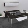 The large rectangular desk features top quality laminate construction that’s scratch resistant and easy to clean. As pictured, it is shown in an Espresso finish including a storage credenza and a wall mounted hutch with laminate doors and a floated glass top. The credenza base, modesty panel and hutch doors come standard in a Blanco finish and there are multiple finishes available for all other laminate surfaces. Guaranteed by a limited lifetime warranty.