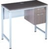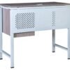 The small standing desk is made from high quality materials including a steel frame and a laminate top that is scratch and scoff resistant. It’s available in different sizes, finishes and you can choose from multiple sets of drawers. The model in the picture has a Driftwood finish with a modesty panel and one set of drawers.