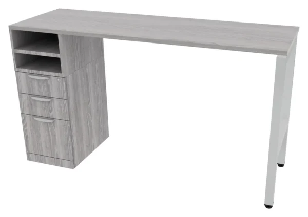 This standing desk with drawers can be custom ordered in a variety of sizes and finish options—Newport Gray shown. It features two box drawers, one file drawer, and two open shelves, offering ample storage and organization. Built for durability and style, it’s backed by a 5-year manufacturer’s warranty for added peace of mind.