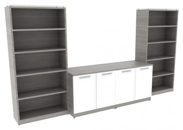 The credenza with storage has two sets of hinged glass doors with cast aluminum handles, and two tall bookcases topped with floating glass. Made from commercial grade laminate, it features PVC edge banding to protect the corners and comes equipped with adjustable leveling glides for added stability. It is available in multiple finish options and is backed by a limited lifetime warranty.