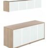 This credenza storage cabinet with wall mount hutch is a part of the Potenza series by Corp Design. As pictured the shell is shown in the Noce finish with your choice of glass or laminate doors and finish. Quality backed by a limited lifetime warranty.