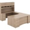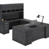 The u shape executive desk has a reversible bridge that can be installed to have the opening on either side. It’s available in different sizes, finishes and you have your choice of drawers for storage. The model in the picture has a Grigio finish with one set of drawers and a hutch for overhead storage. Quality backed by a limited lifetime warranty.