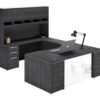 This U shaped desk from Corp Design tops a large worksurface with a hutch storage unit designed to the standards of their modern Potenza series. The matching-finish doors on the overhead storage serve to contrast the white glass modesty panel. Quality guaranteed by a limited lifetime warranty.