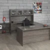 The u shaped office desk is made from a commercial grade laminate and it includes a hutch with wood framed glass doors and a small bookcase. The model in the picture has a Urban Walnut finish with built in grommets and one hanging set of drawers. It’s available in different sizes, finishes and you have your choice of drawers for storage. Quality backed by a 5-year manufacturer’s warranty. rephrase this para