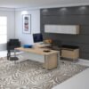 The modern u shape desk comes with an acrylic modesty panel, two lateral storage drawers and a wall mounted hutch with glass doors. It’s available in different sizes and finishes with your choice of drawers for storage, Miele finish shown. Quality guaranteed by a limited lifetime warranty.