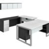 The electric sit stand desk is available in different sizes with your choice of drawers for storage. You can select a top finish for the desktop and bridge, you can also select a base finish for the credenza, side storage and hutch. It’s shown in a Blanco finish for the top, Grigio for the base and it has 1 mobile set of drawers and 1 full set of pedestal drawers. It includes a wall mounted hutch and it’s backed by a limited lifetime warranty.