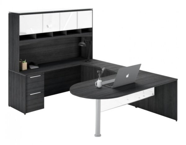 This U shaped peninsula desk is part of the Potenza series by Corp Design. Available in several different sizes, finishes and your choice of storage and desk accessories. As pictured the desk is shown in an Grigio finish with hutch and full pedestal drawer. Manufactured with high-density laminate and quality backed by a limited lifetime warranty.